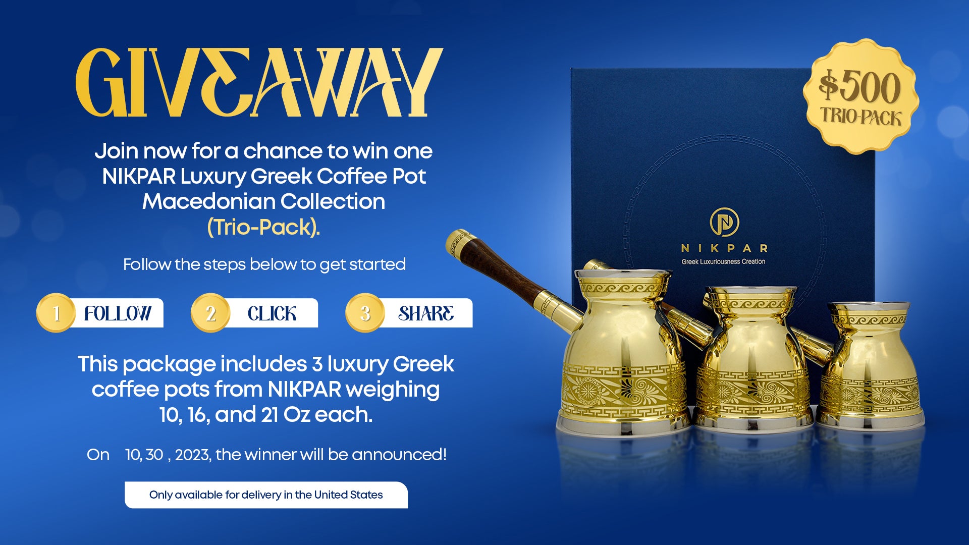 Join now for a chance to win one NIKPAR Luxury Greek Coffee Pot Macedonian Collection (Trio-Pack).